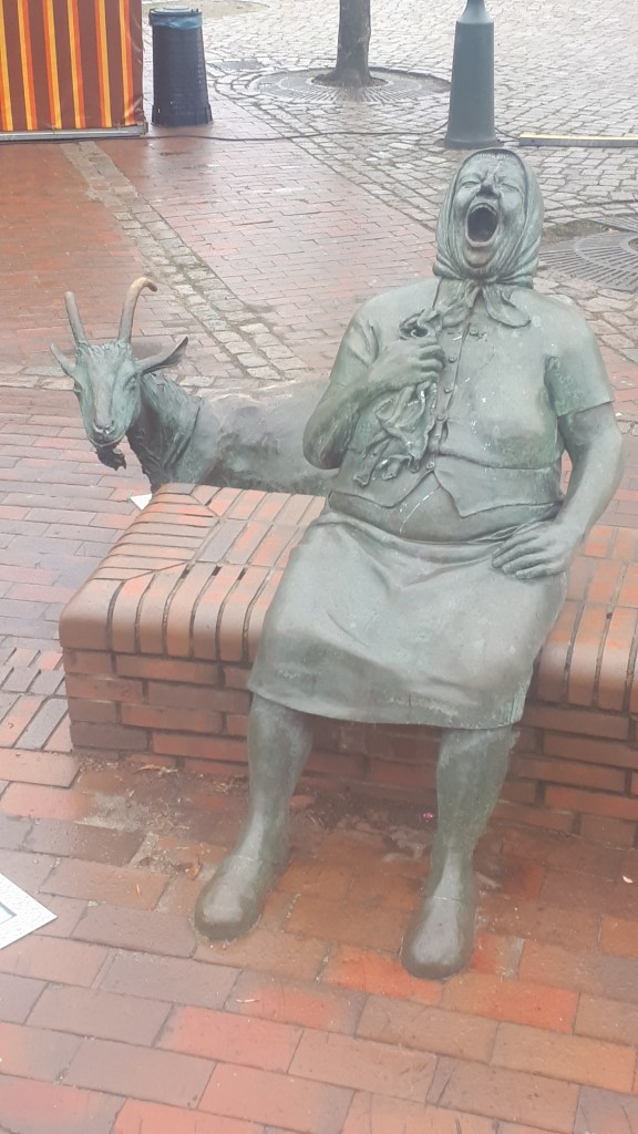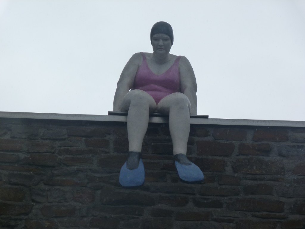 Nous visitons cette ville et là, à notre grande surprise et amusement, malgré un temps maussade d’autres statues comiques telles ces filles sur un mur,