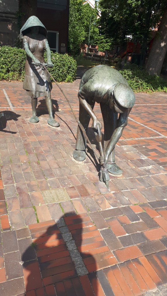 Ces sculptures nous racontent souvent les travaux de la vie courante du temps passé. Ici le travail pour la fabrication des briques de tourbes en basse-Saxe.