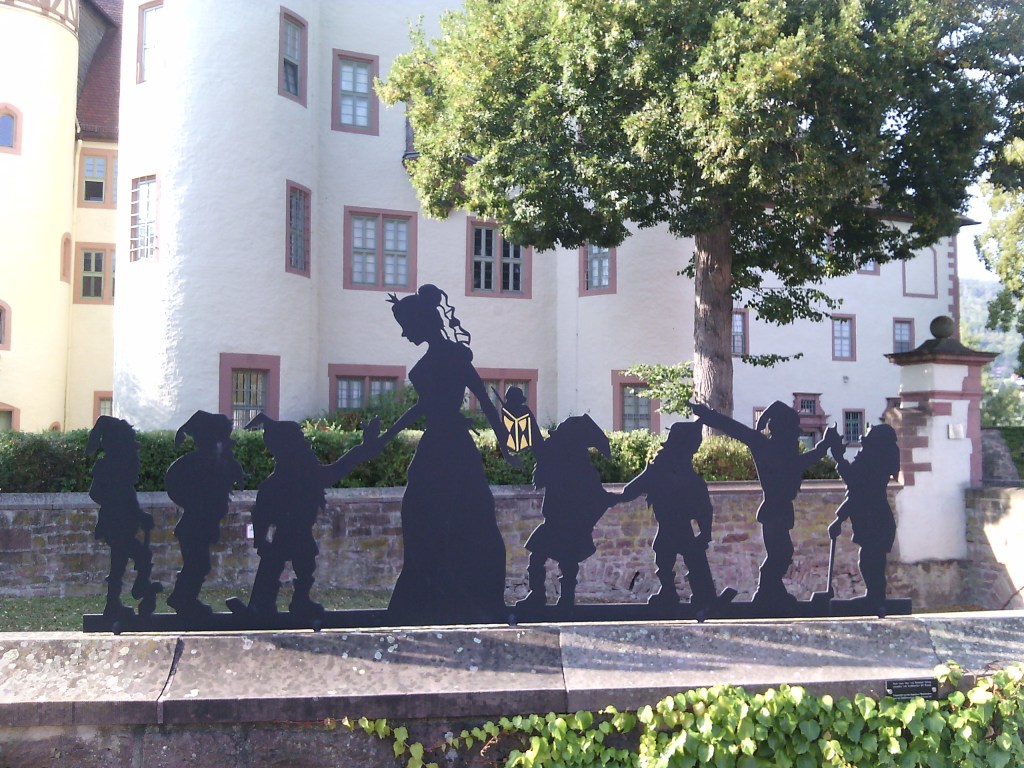 Nous rencontrons Blanche Neige et ses nains devant son chateau,