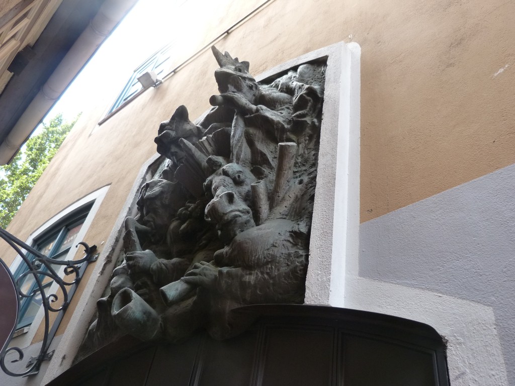 A remarquer qu’une statue similaire existe sur le tympan d’une porte de la cathédrale de Strasbourg. Les tailleurs de pierres étaient des spécialistes pour cacher au milieu de tous les personnages religieux, des statues profanes, montrant de l’incrédulité, parfois provoquante.