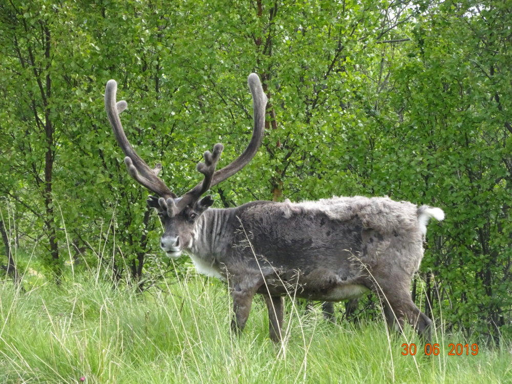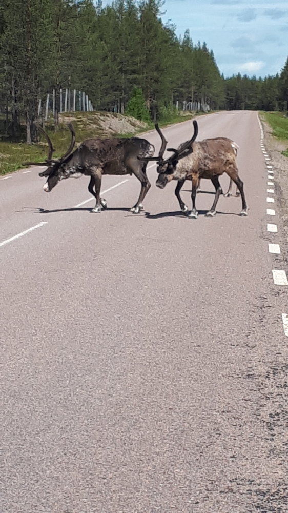 Peu de temps après le panneau, point d’élan mais un troupeau de rennes qui traverse la route juste devant nous. Moment de surprise et d’émotion. Des rennes nous en verrons régulièrement et chaque fois avec de l’admiration.