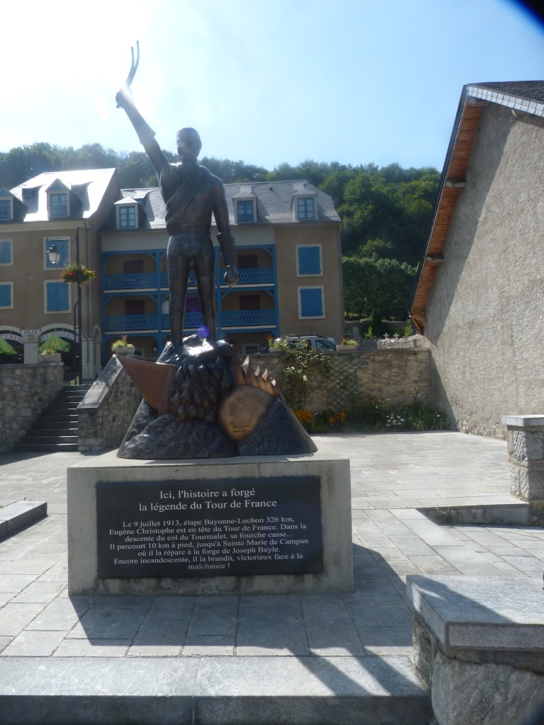A l’époque pas de suiveur qui donne un nouveau vélo. Le règlement va encore plus loin, interdit de se faire dépanner il faut réparer soi même. Eugène va marché quatorze kilomètre jusqu’a Sainte Marie de Campan. Il effectue lui même sa réparation dans la forge du village. Au coeur du village, une statue le montrant heureux sortant de la forge en brandissant sa fourche réparée.