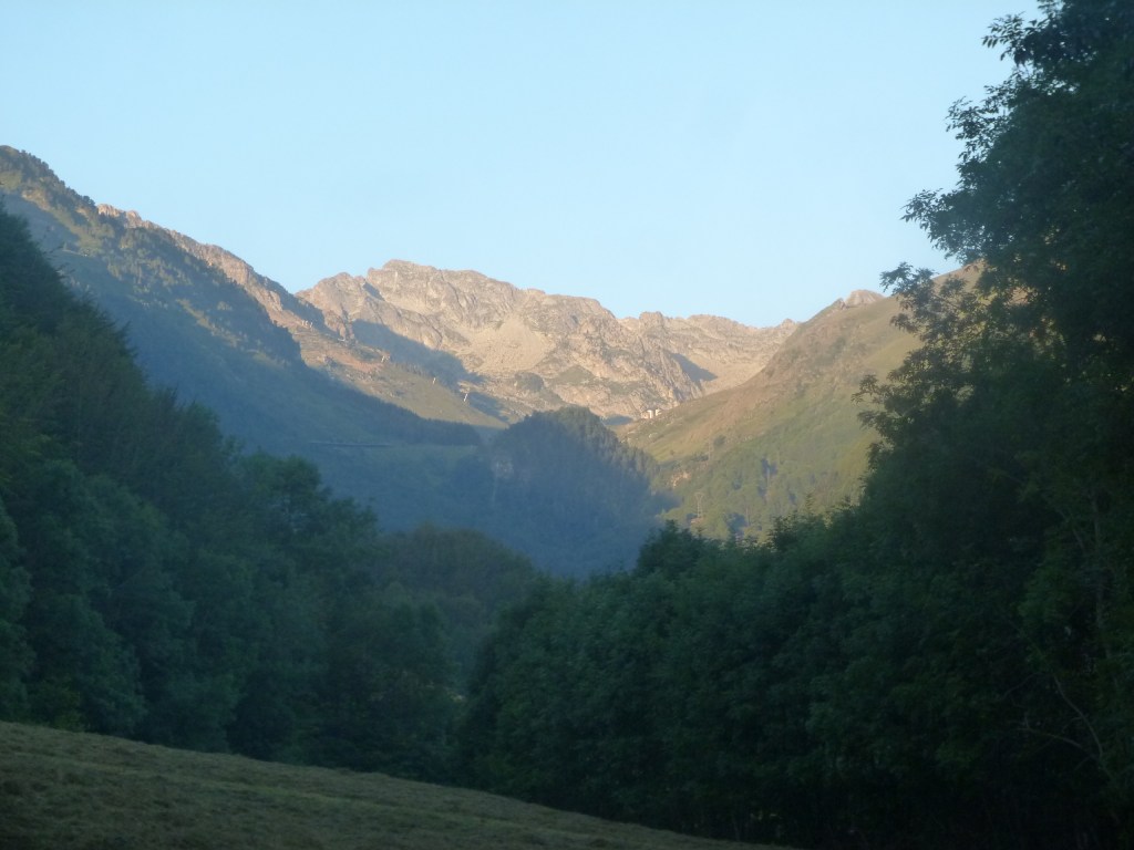Le soleil illumine les sommets afin de nous donner toute la force nécessaire pour gravir le col. On aperçoit quelques bâtiments de la Mongie. Station de ski située à quatre kilomètres et demi du sommet et d’où part le téléphérique pour le Pic du Midi.
