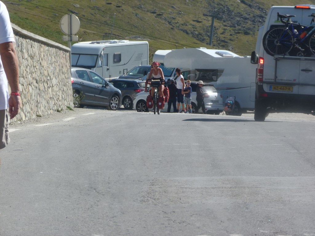 Le col est étroit, le parking pour les véhicules se trouve en contre bas, ici c’est le domaine des cyclistes. Nombreux, très nombreux et parlant toutes les langues. Tous les amoureux de la petite reine se retrouvent ici.