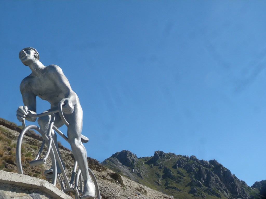 Une statue commémorant l’exploit d’Eugène Christophe lors du tour de France 1913. Il passe en tête le sommet, aborde la descente et à ce moment la fourche de son vélo se casse.