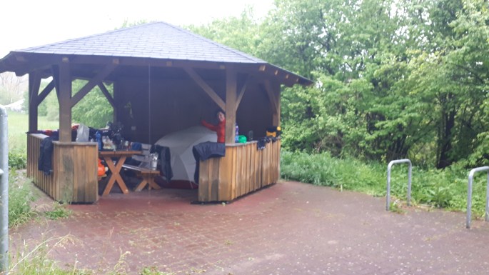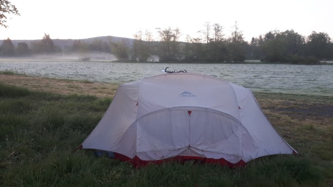 Le soir on monte la tente en bord de piste cyclable et on arrose notre départ.