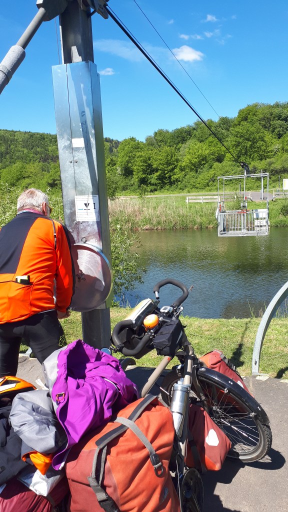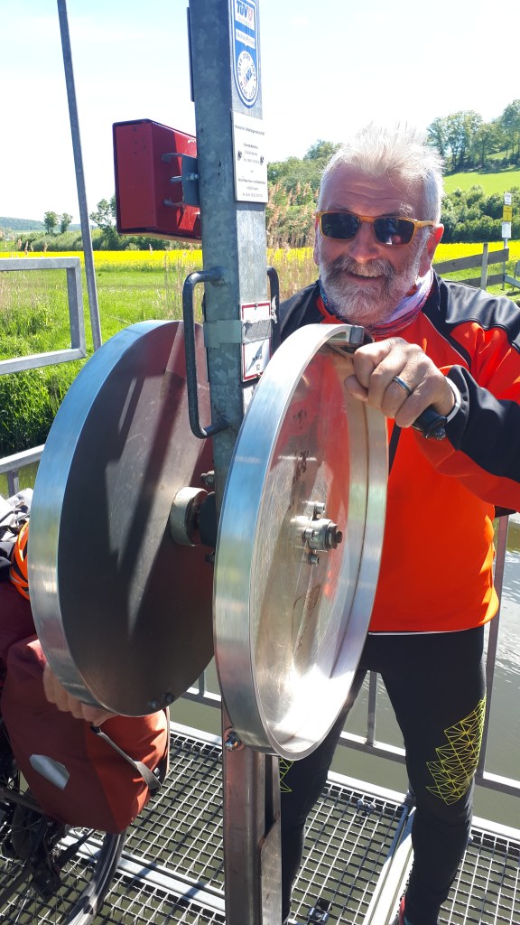 Plus loin, nous nous amusons sur cette nacelle où il faut pedaler avec les bras pour traverser la fulda.