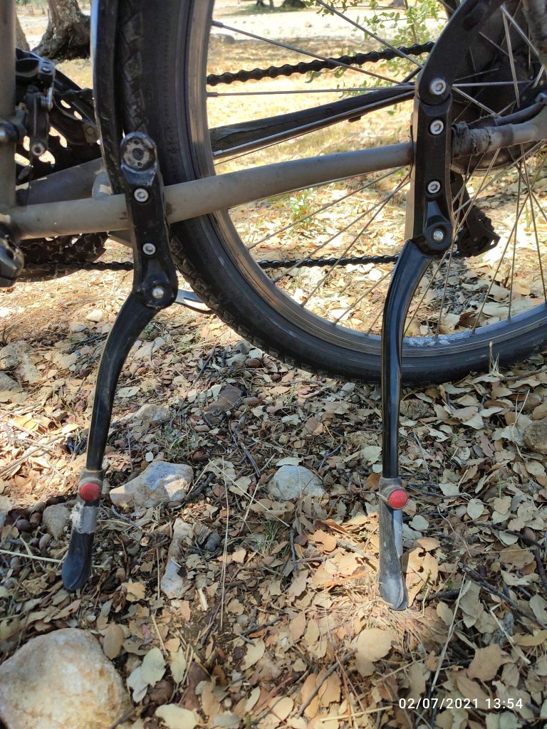 Le souci que j’ai rencontré c’est de trouver une béquille solide permettant de supporter les 40 kg voir plus. Après de nombreux essais de différentes marques, j’ai trouvé la solution très simple: deux béquilles et depuis plus de problèmes. Il peut y avoir d’autres solutions, tel qu’une béquilles à l’avant en plus de l’arrière ou une béquilles central mais sur ce type de vélo impossible d’adapter une béquille centrale et compliqué pour celle de devant.