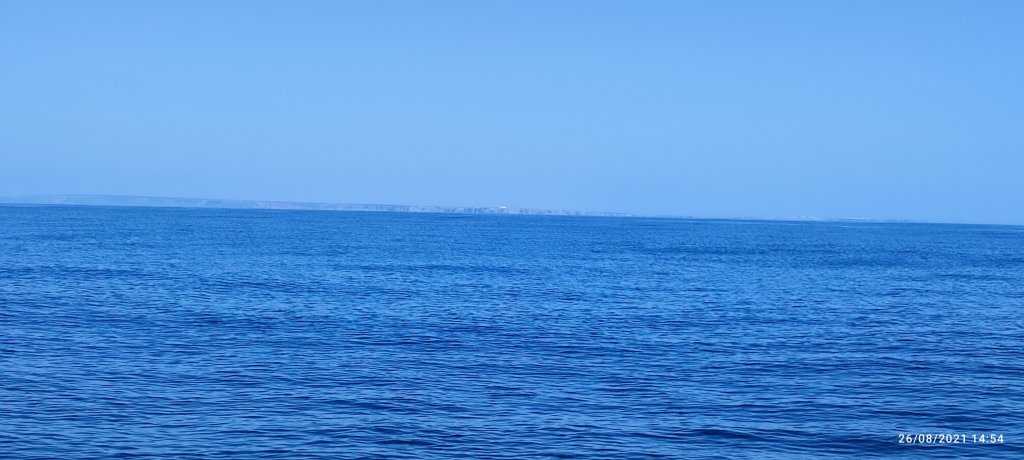 nous embarquons sur un puissant bateau à moteur. Très rapidement la côte et la pointe de Sagres n’est plus qu’une fine ligne à l’horizon.