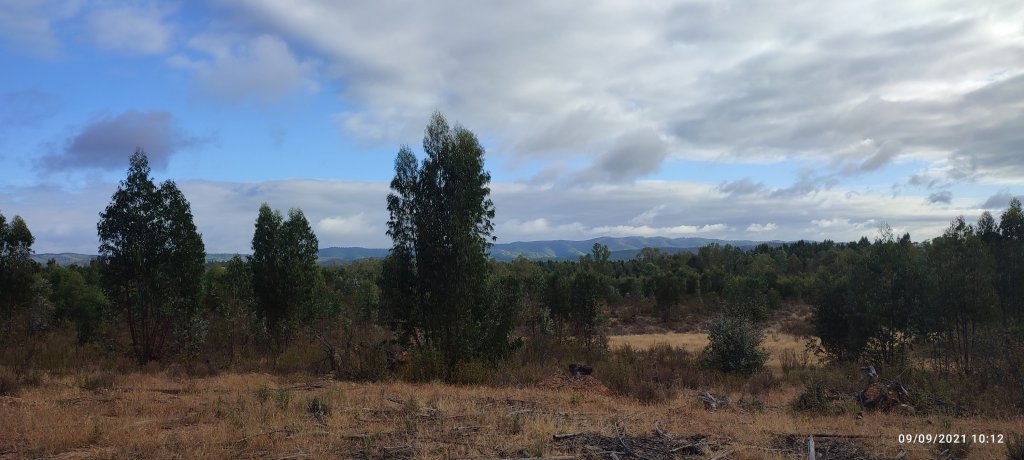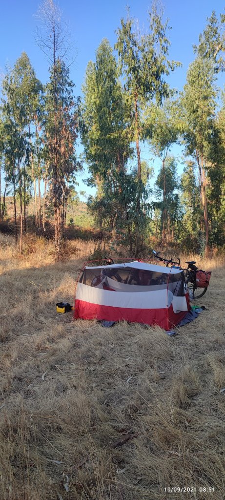 Au sortir de cette ville nous roulons sur une route nationale très circulante, l’heure avance et les jambes deviennent lourdes. Après quinze kilomètres un chemin s’enfonce dans une forêt d’eucalyptus, c’est pour nous. Après un bon kilomètre sur un chemin de terre, nous nous trouvons un havre qui ne sera pas vraiment de paix car le bruit de la circulation parvient jusqu’à nous.