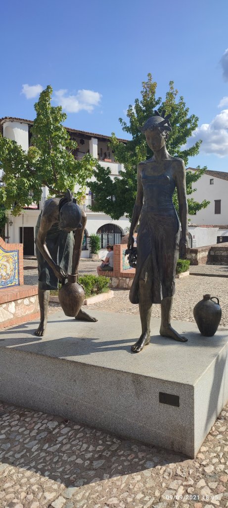 Sur une place une statue représentant deux femmes maures cherchant de l’eau.