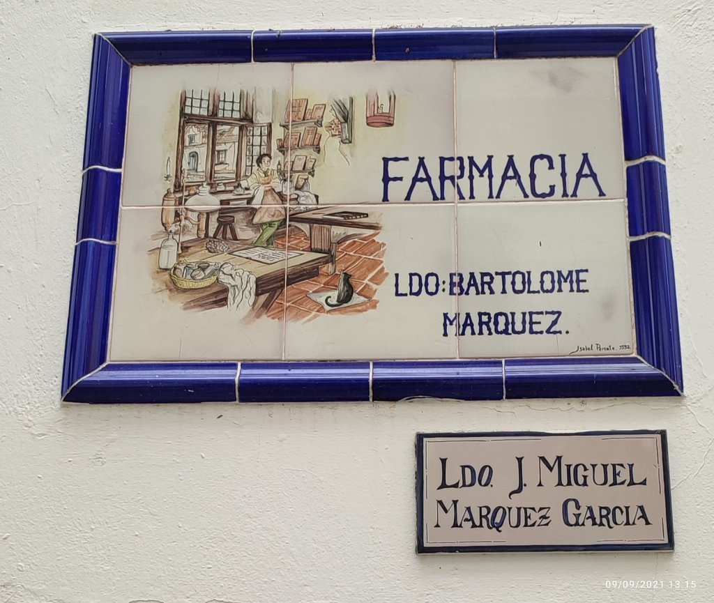 les azulejos sont colorés dont celui-ci indiquant la pharmacie. Plus jolie que la conventionnelle croix verte.