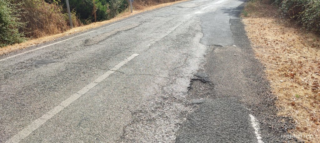 Notre journée ne vas pas être nerveuse, dès le matin il s’est mis à faire très chaud et pendant plus de 20 kilomètres la route est en piteux état. Non seulement ce n’est pas roulant et l’effort à fournir est plus important, mais il faut une grande concentration pour éviter les nombreux trous. Heureusement peu de circulation ce qui nous permet de choisir la partie la moins abîmée.