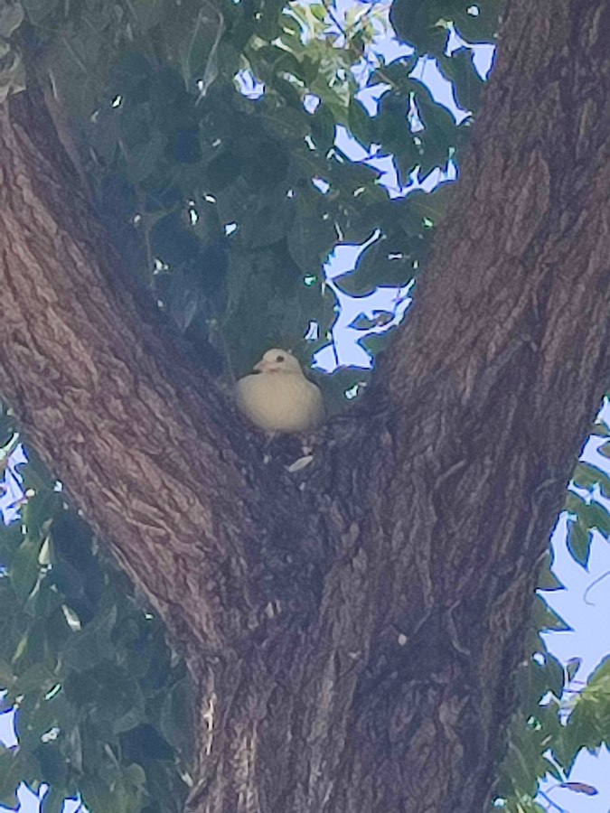 Nous avons remarqué une colombe qui doit être sur son nid, car elle n’a pas bouger depuis notre arrivée et observe de son perchoir tout se ramdam. Elle aussi doit être contente quand tout se calme.