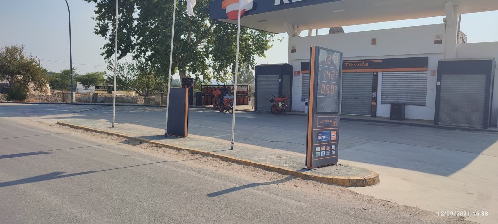Le paysage ici n’est pas extraordinaire de grandes cultures de coton et d’immense vergers, la route est baignée par la chaleur du soleil, le thermomètre indique 44° C. Nous sommes heureux de croiser cette station service a qui on a supprimé toute activitée en lui retirant ses pompes.