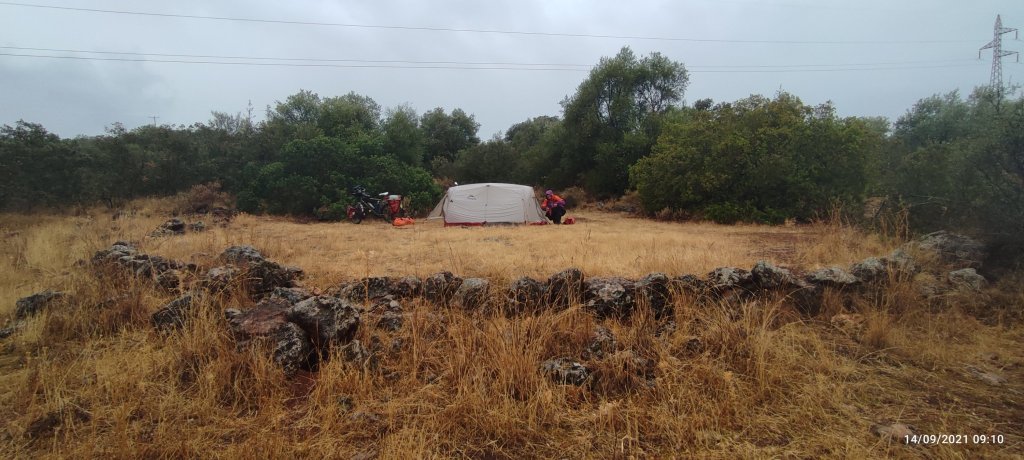 Cela semble compliqué au milieu de ces vergers d’oliviers ou pas un seul brun d’herbe ne pousse. Impossible de s’installer dans ce sol terreux devenu collant avec la pluie. Voici un verger enherbé, c’est une invitation, aucunes tergiversations, Laetitia part en reconnaissance et trouve une belle plate forme à l’abri des regards.