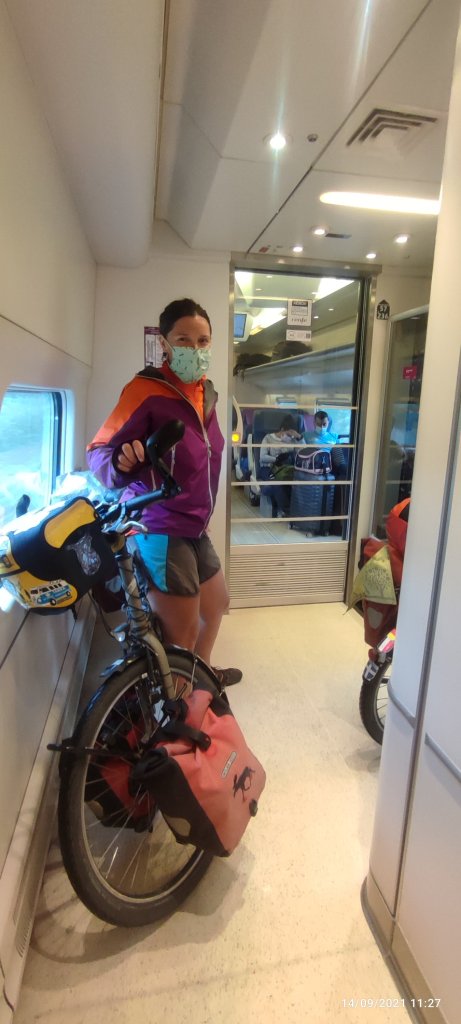 La vie continue à nous sourire, car voici le train et c’est l’équivalent d’un TGV français. Le contrôleur nous aide à monter et une fois à l’intérieur il nous dit que normalement on a pas le droit de monter avec des gros vélos chargé, mais bon pour une fois… et effectivement le billet sera moins cher de 0,40 centimes.