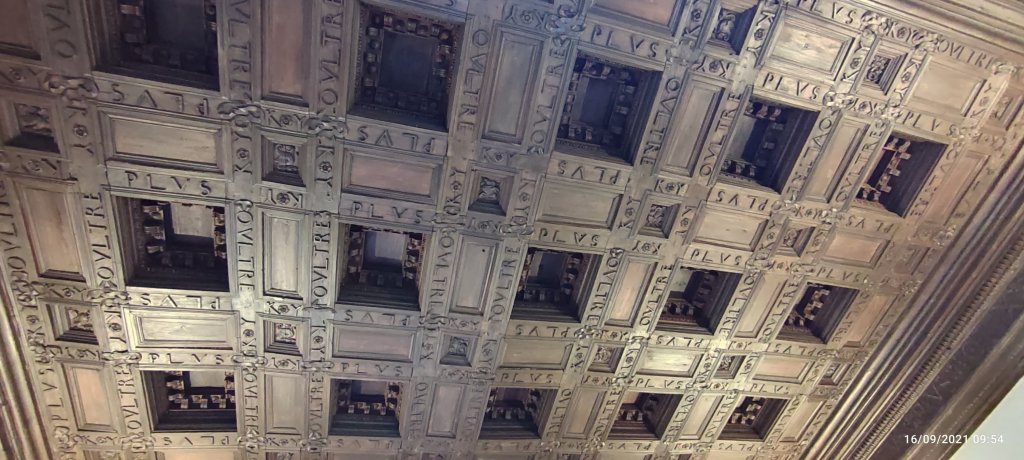 Le plafond de la première salle où il fit inscrire la devise nationale Espagnole : Plus Ultra. Devise qu’il adopte au XVI e siècle.
