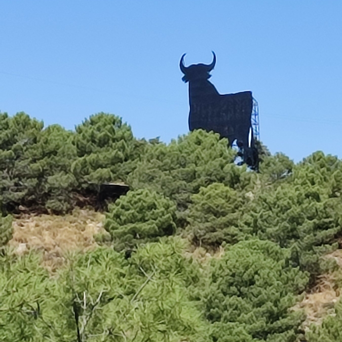 Au détour d’un virage un immense taureau nous fait face. Nous en avons déjà vu souvent en Espagne. Mais beaucoup de monde ignore la présence de telles enseignes qui surgissent à l’improviste dans le décor. Il y a quelques dizaines d’années en arrière c’était alors une publicité pour un brandy de la marque Osborne. Toute mention publicitaire a aujourd’hui disparu et le Taureau Osborne est devenu l’un des symboles de l’identité Espagnol.
