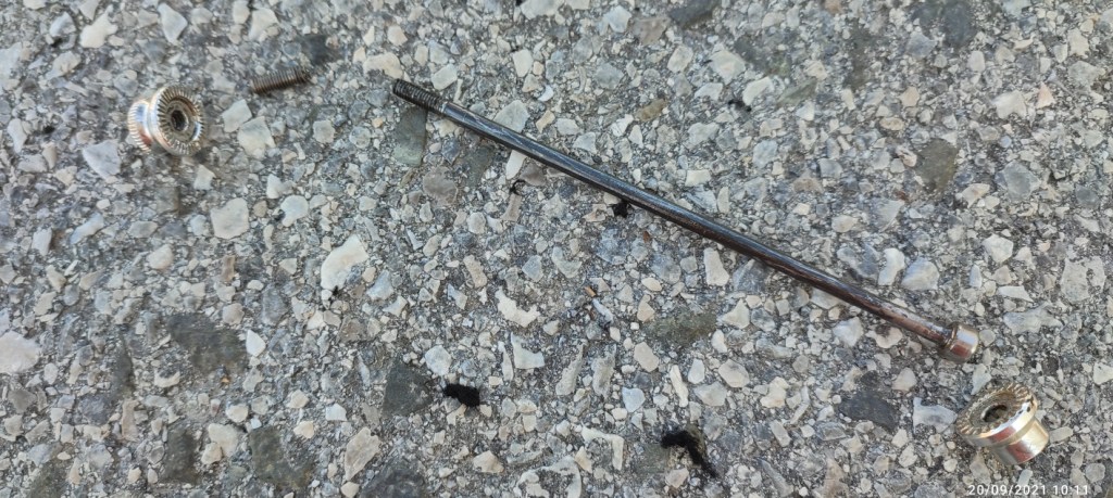 Le patin c’est usé plus que de normal. Avec Laetitia nous regardons le frein mais elle sent quelque chose d’anormal dans la roue arrière. On l’a fait tourner en roue libre rien de bizarre, si ce n’est que Laetitia lui trouve un peu de jeu.