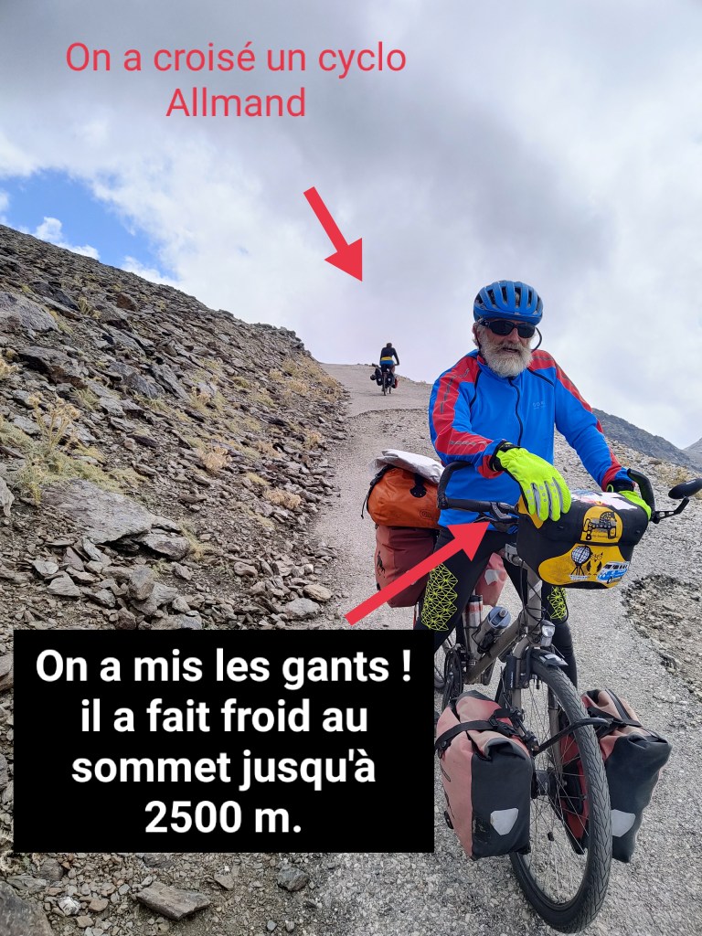 Le vent se lève et la masse nuageuse cache le soleil, la température chute rapidement et pour la suite comme la route est en meilleur état nous allons prendre de la vitesse il faut avant toute chose nous couvrir. Trois couches pour le torse, un pantalon et des gants sont nécessaires.