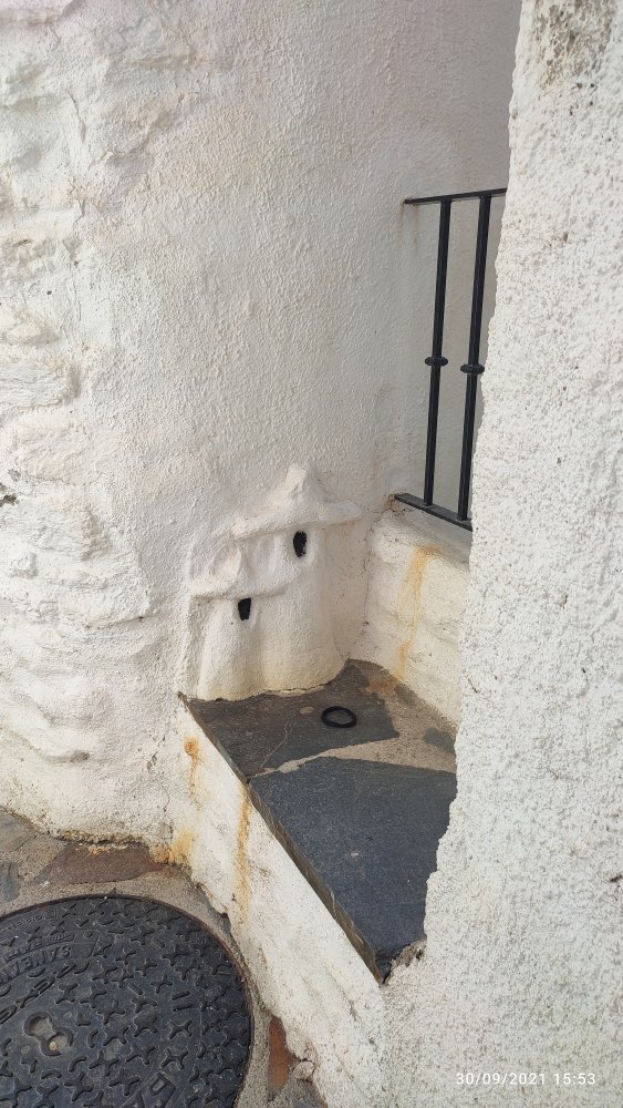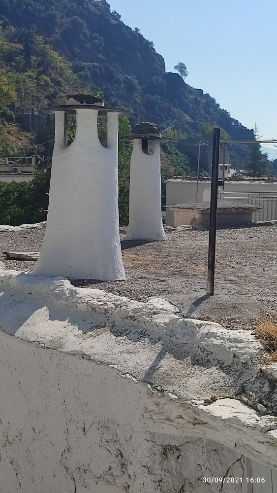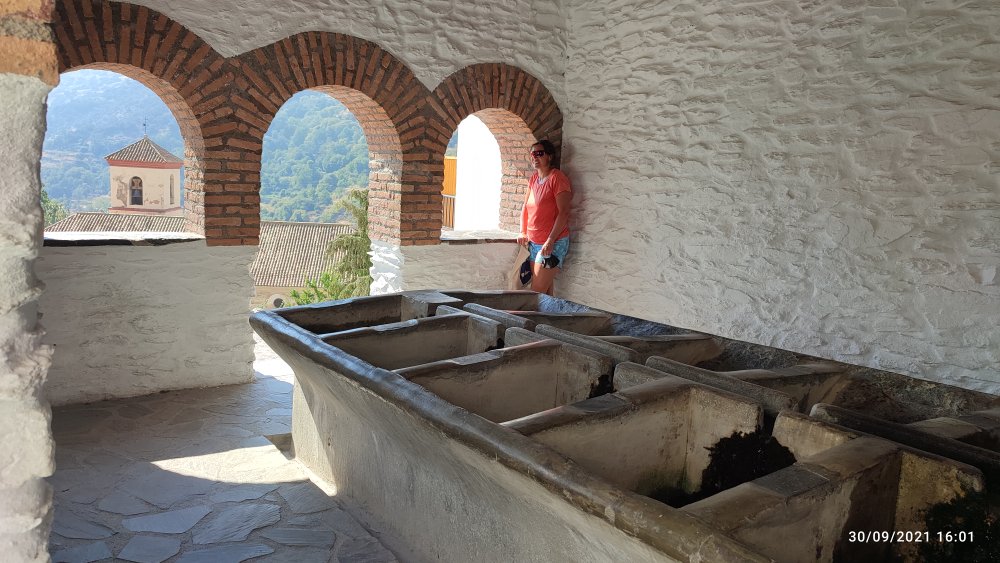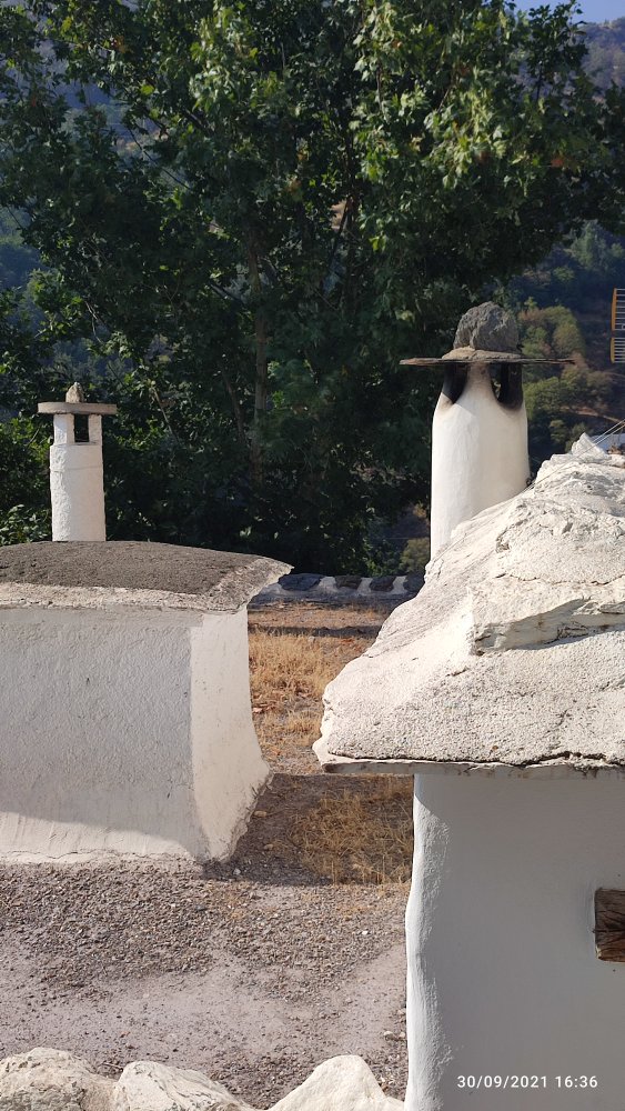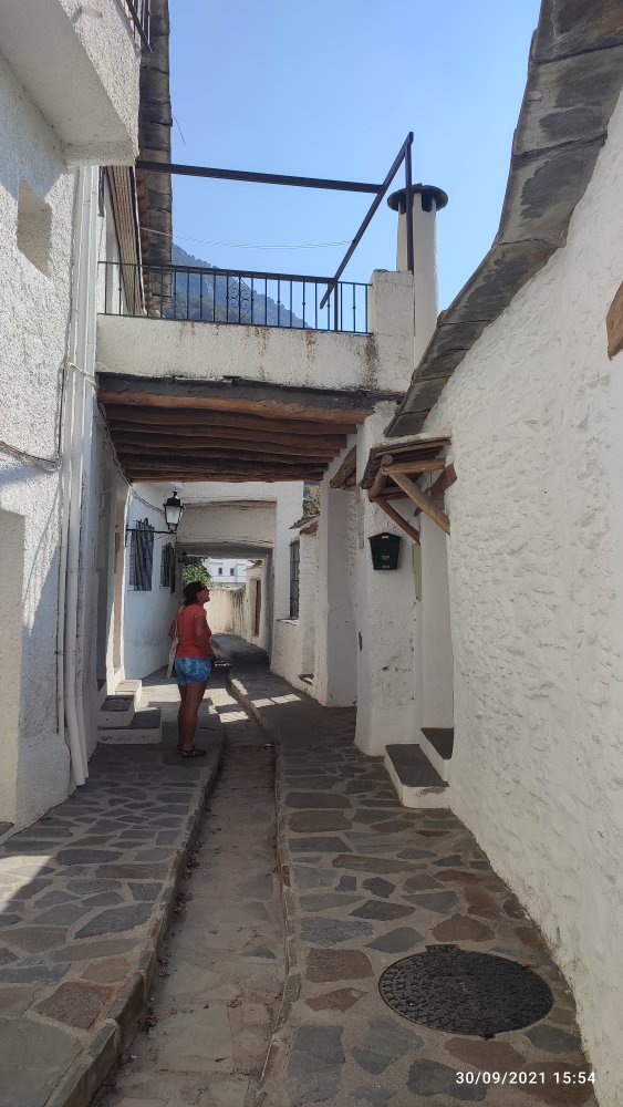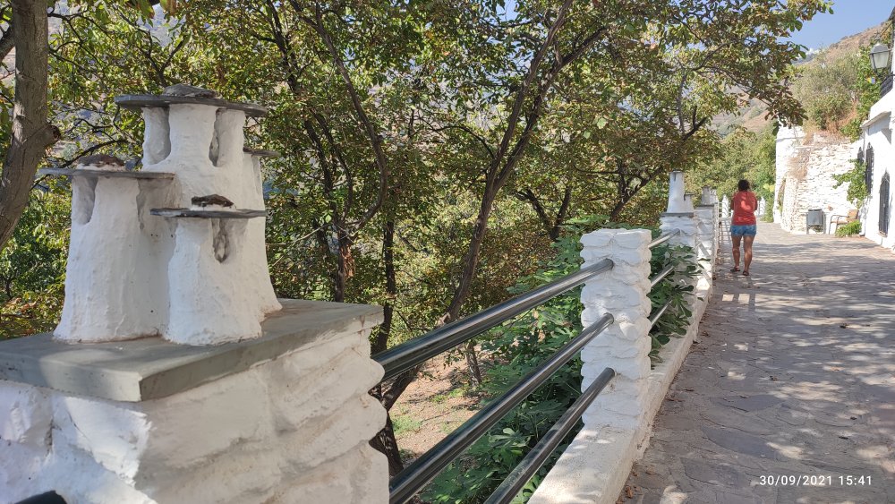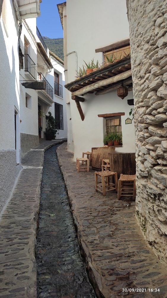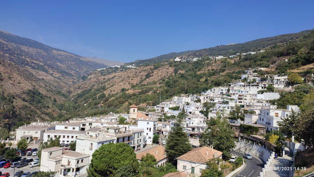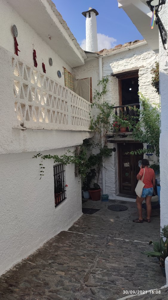 Nous mangeons à l’entrée du village de Pampaneira. Accroché au flanc très pentu de la montagne. On se demande ce qui a pu pousser les hommes à construire aux environs du X ème siècle dans un tel site. Sachant que l’accès devait être extrêmement difficile, nous sommes encore à 1170 mètres d’altitude.