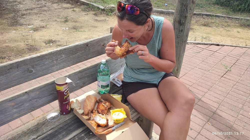 Nous trouvons un parc un peu sale et peu entretenu pour notre repas, mais celui-ci va nous combler : du poulet avec une sauce aïoli, un vrai bonheur. Il ne nous faut vraiment pas grand chose.