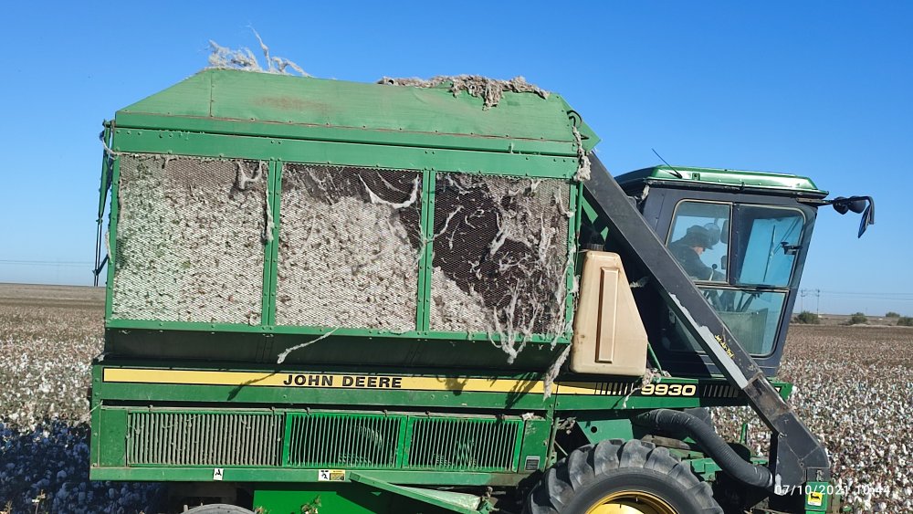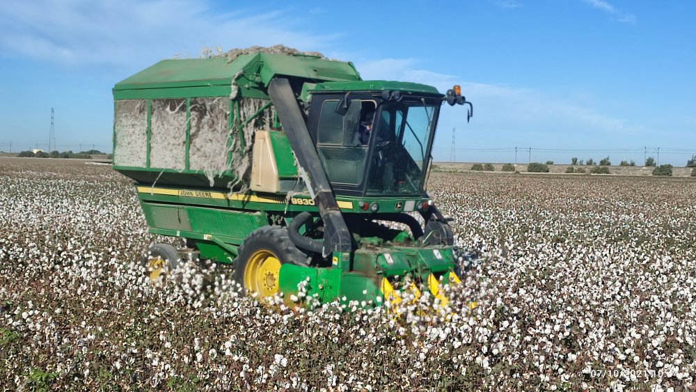 Depuis hier, nous sommes intrigué par le système de récolte du coton. A peine 10 km d’effectué, voici que dans un champs un cultivateur récolte le coton avec une machine semblable aux moissonneuses batteuses.