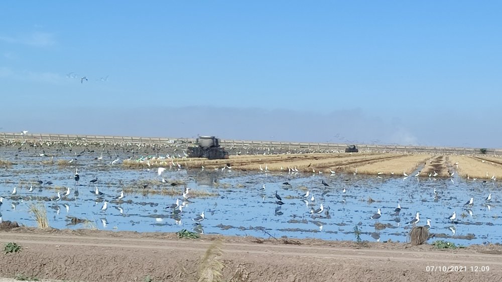Nous voici maintenant au milieu des rizières. Ils broient la paille avec d’énormes tracteurs et cela fait le régal d’oiseaux de toutes sortes: