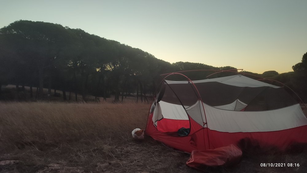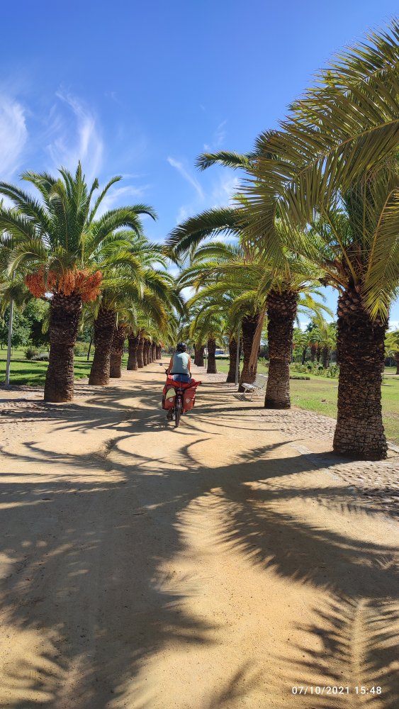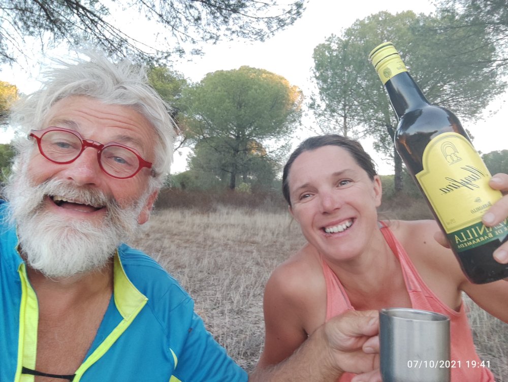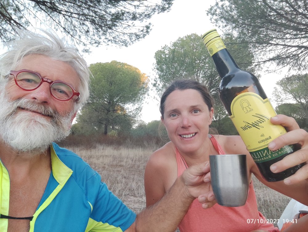 Le rio franchit, une pause rafraîchissement avec du raisin et nous repartons dar dar pour notre dernier round de la journée. A la sortie du bac nous sommes à Coria del Rio. La traversée de la ville et les kilomètres qui s’en suivent sont très pénible vue l’importance de la circulation. De nombreux automobilistes nous saluent à coup de klaxon, un groupe de cyclistes nous doublent et nous lancent des mots encourageants. Cependant, ce qui nous fait le plus de bien, c’est de nous retrouver sur une route traversant une forêt de pins où la circulation est presque inexistante. Et c’est dans ce lieu que nous allons passer notre nuit, après 81 km et 218 m de D+.