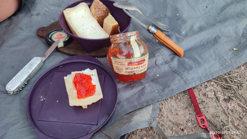 Pour l’instant fini les étapes difficiles de montagnes nous nous dirigeons vers la mer, alors nous pouvons abuser un peu et dégustons un vin de Manzanilla. Vin voilé au parfum très particulier. Accompagné de queso de cabra et une confiture piquante. Que veux t’on de plus … Nous rien !