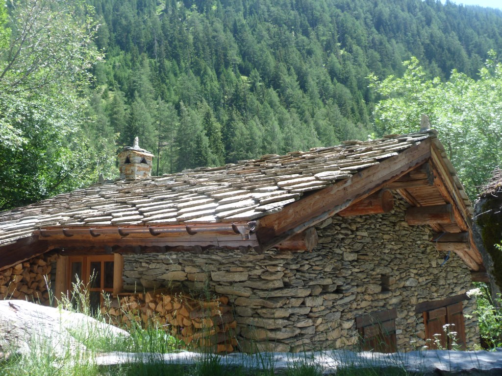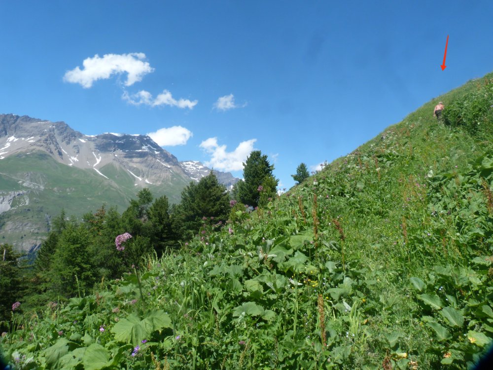Le soleil est chaud et c’est bien agréable de se promener au son de la symphonie des clarines des vaches. Mais enfin, nous sommes bien haut en rapport à la petite boucle que nous avions prévu. Au loin nous apercevons des maisonnettes, nous y trouverons une indication. Il nous faut encore grimper un sentier bien raide au travers d’une prairie qui va nous faire transpirer.