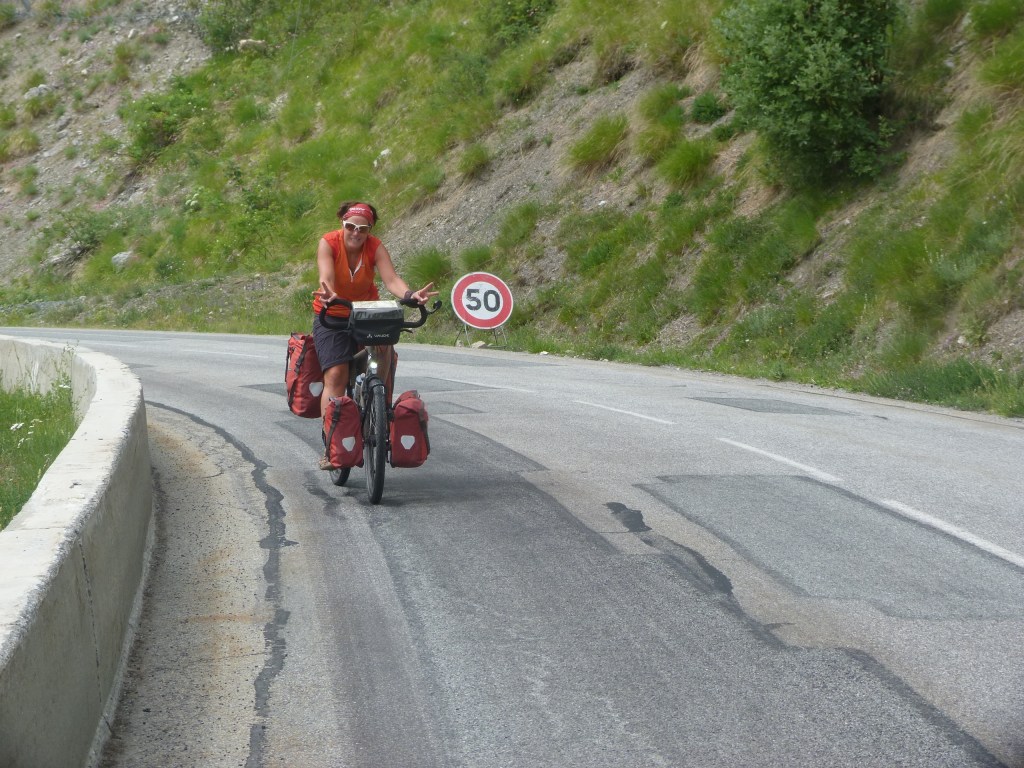 Les presque 50 km déjà parcouru m’ont bien échauffé les muscles et je monte aisément ce col, il n’en n’est pas de même pour Laetitia qui n’arrive pas à trouver son rythme. Il n’y a rien de plus compliqué quand dans une montée on ne trouve pas la cadence, on n’est pas à l’aise, les jambes, le coeur et le souffle n’arrivent pas à se mettre en accord: ça énerve, ça fait souffrir, mais cela n’entame pas sa bonne humeur et son sourire.