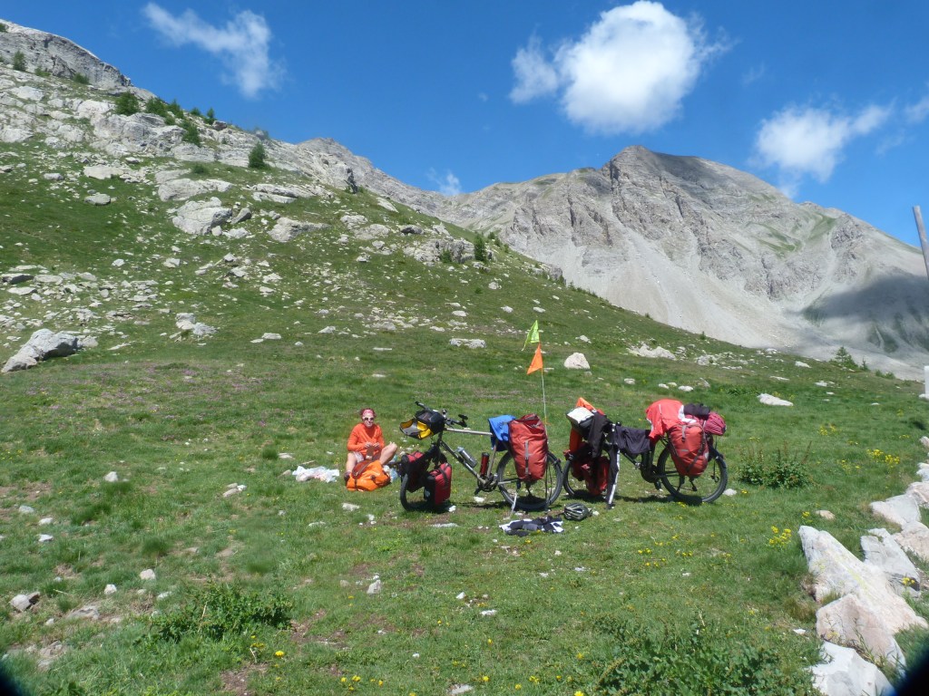 Nous voici au col de la Cayolle, nous nous installons dans l’herbe fraîche pour le casse-croûte