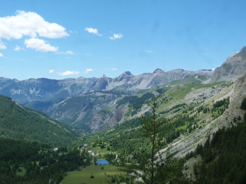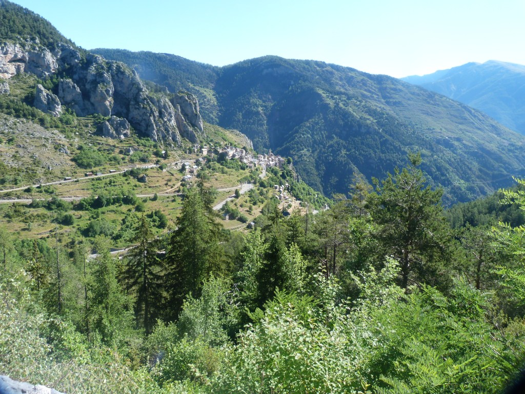 La route est calme dans ce col, nous retrouvons la chaleur et pour nous stimuler nous sommes accompagnés du chant des cigales, ce qui nous ravit. Mais voici des jours et des jours que nous sillonnons au travers de ces sommets et pics. Que nous voyons sur le bord de la route des panneaux indiquant les sentiers de randonnées cette fois ci nous n’y tenons plus, il nous faut poser nos vélos et grimper dans ces montagnes, prendre de la hauteur. Il y a quelques jours, la météo instable nous faisait hésiter, le temps c’est définitivement mis au beau, nous ne résistons plus à la grandeur de ce désir. Nous arrêtons notre ascension  à St Dalmas où nous allons au camping municipal et demain nous trouverons bien un sommet à gravir dans les environs.