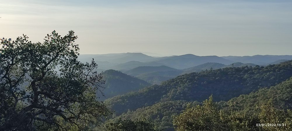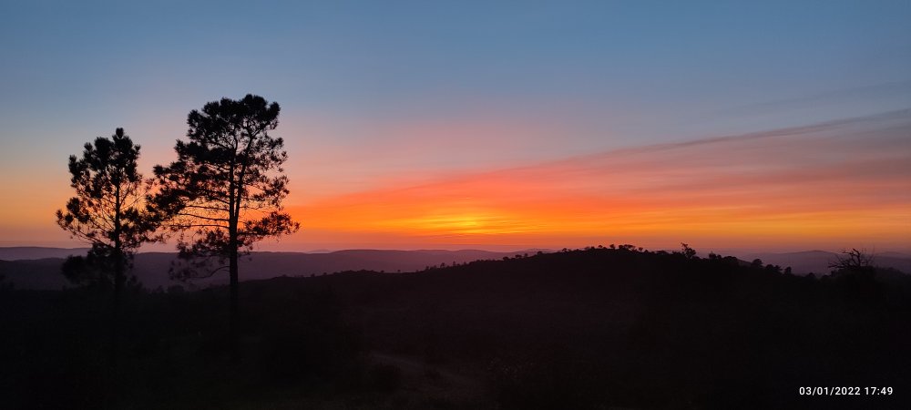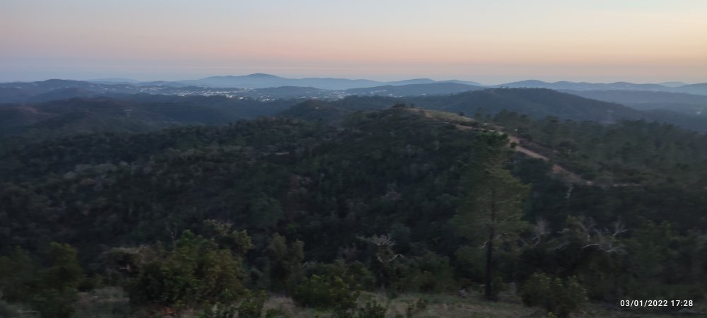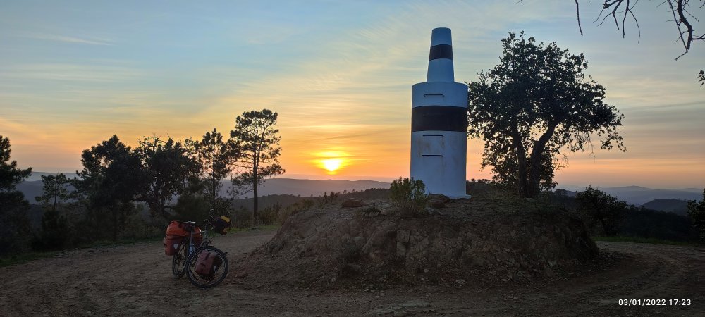 Nous y voici le point géodésique de Bispo à 480 mètres d’altitude. Nous dominons les montagnes, les vallées et la mer est à l’horizon.
