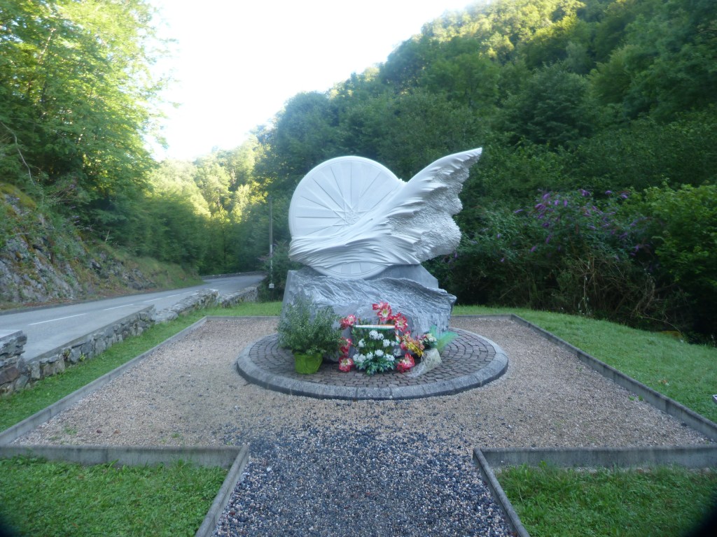 C’est très prudemment que nous effectuons cette descente et nous nous arrêtons devant la stèle construite au lieu exact où Fabio à chuté, nous ne sommes pas de la même trempe mais unis par une même passion : le vélo. Cela s’exprime par un recueillement.