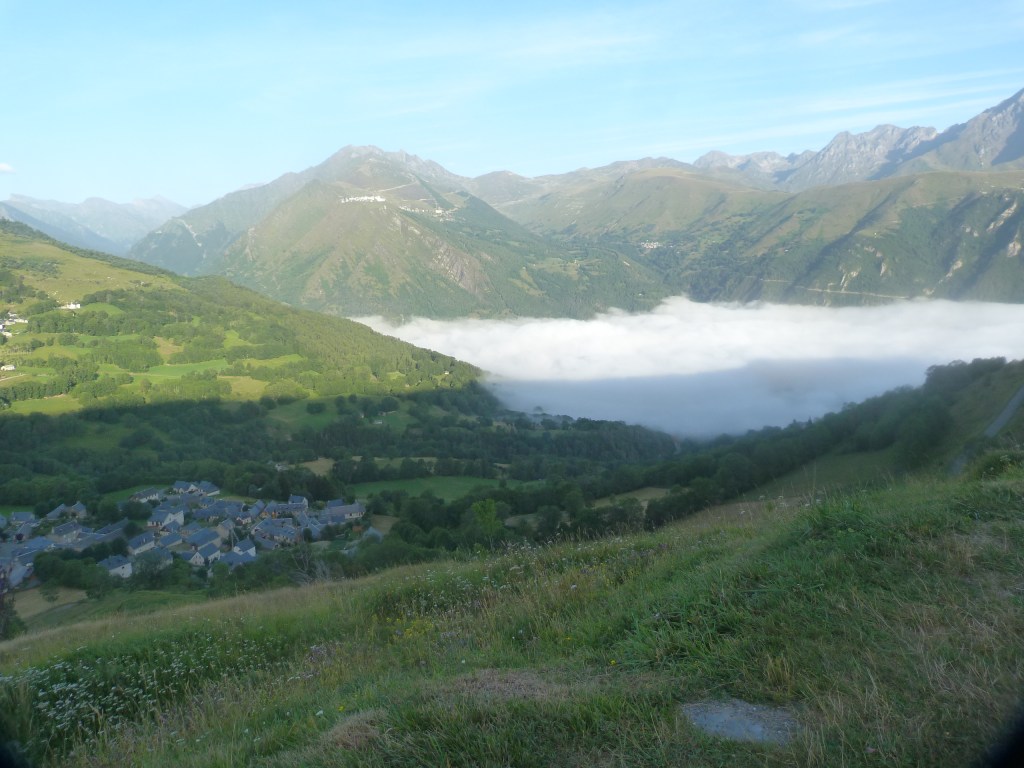 Nous remontons sur nos vélos avec le soleil et disons au revoir au Tourmalet après quelques kilomètres de descente nous pénétrons dans la masse cotonneuse et duveteuse de nuages la température n’est plus la même et la fraîcheur nous paralyse légèrement. Voici Luz St Sauveur où nous rachetons une béquille, si nous comptons les dépenses pour cette pièce bien utile, je vais la regarder comme un objets en or sertie de diamant !!!