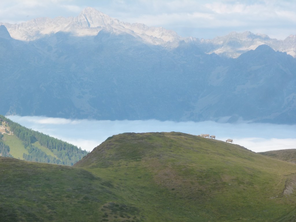 Ce bivouac dans cet environnement ne nous donne pas envie de quitter le lieu trop vite, surtout quand on constate que l’on va descendre et s’enfoncer dans le brouillard. Nous admirons, nous papotons et nous profitons d’une sonate de cloches d’un troupeau de vaches se déplaçant au grés de la meilleure herbe.