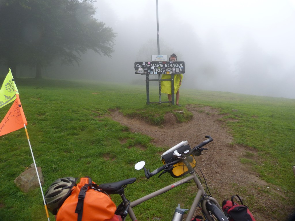 Le sommet se profile, le vent tourne et retourne comme devant une cathédrale où dans les légendes il est dit que c’est le diable qui attend la belle demoiselle pour saisir son âme après le mariage. Bientôt c’est une pluie froide et forte qui s’abat sur nos carcasses mais ce n’est pas cette vilaine intempérie qui nous privera de la traditionnelle photo du col !