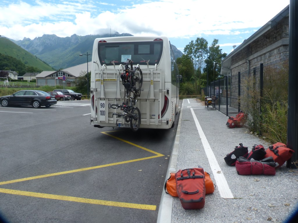 Un jour que nous étions au bar pour faire passer le temps ainsi que le mauvais temps nous sommes interpellés par des jeunes du cru qui sont moniteur de deltaplane. Nous leur expliquons notre parcours et surtout nous attendons une amélioration de la météo pour repartir. A ce moment ils nous disent qu’il n’y aucune amélioration prévue avant huit jours mais nous conseille de prendre le bus,( la route étant très fréquentée) qui passe sous le tunnel du Somport et d’arriver en Espagne ou nous trouverons un beau soleil.