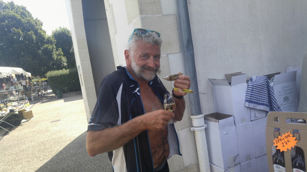 Nous accédons à Vaux sur mer, nous nous rendons au marché et Laetitia repère de suite un stand où il est possible de déguster du pineau des Charentes. Le vigneron nous accueille avec une jovialité débordante et communicative. Nous dégustons, nous parlons voyage et en échange il nous parle vin.