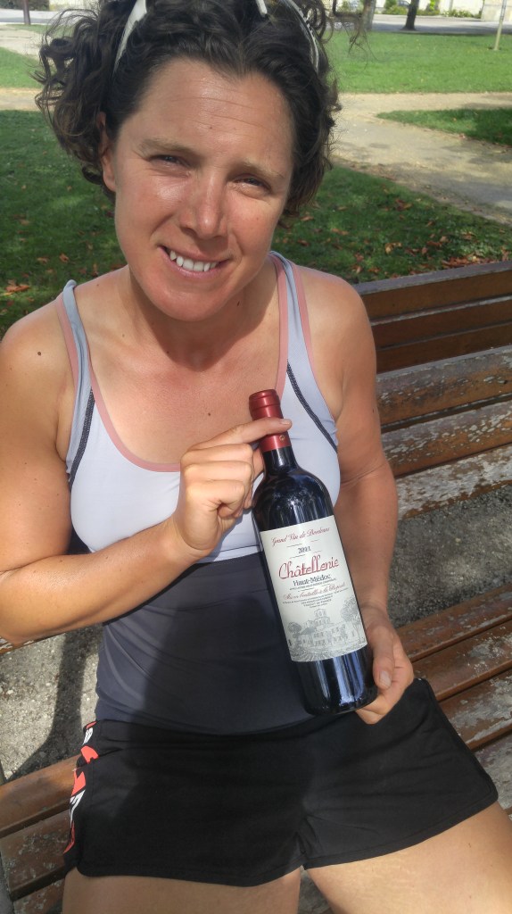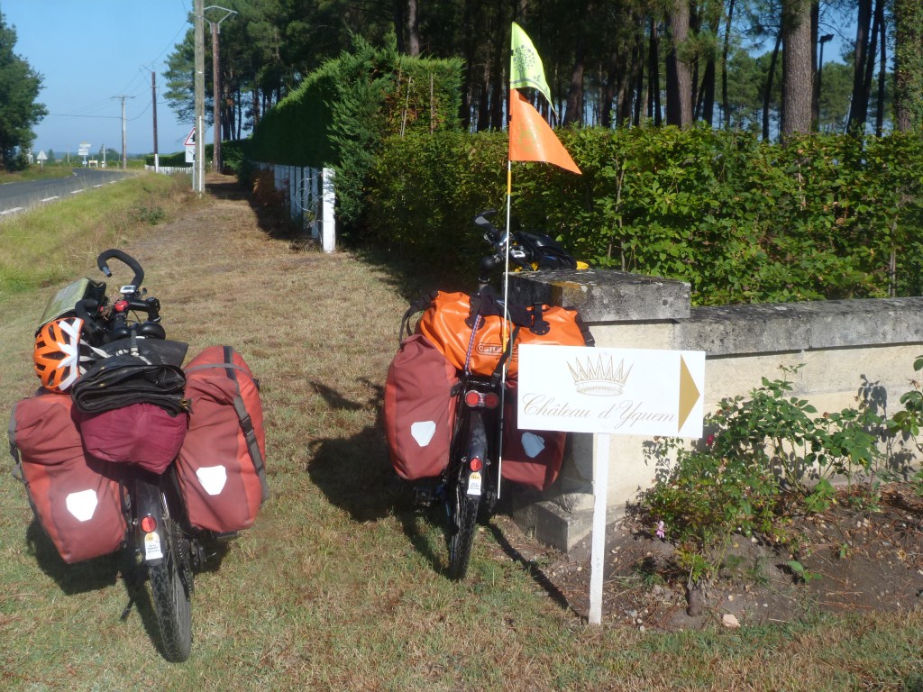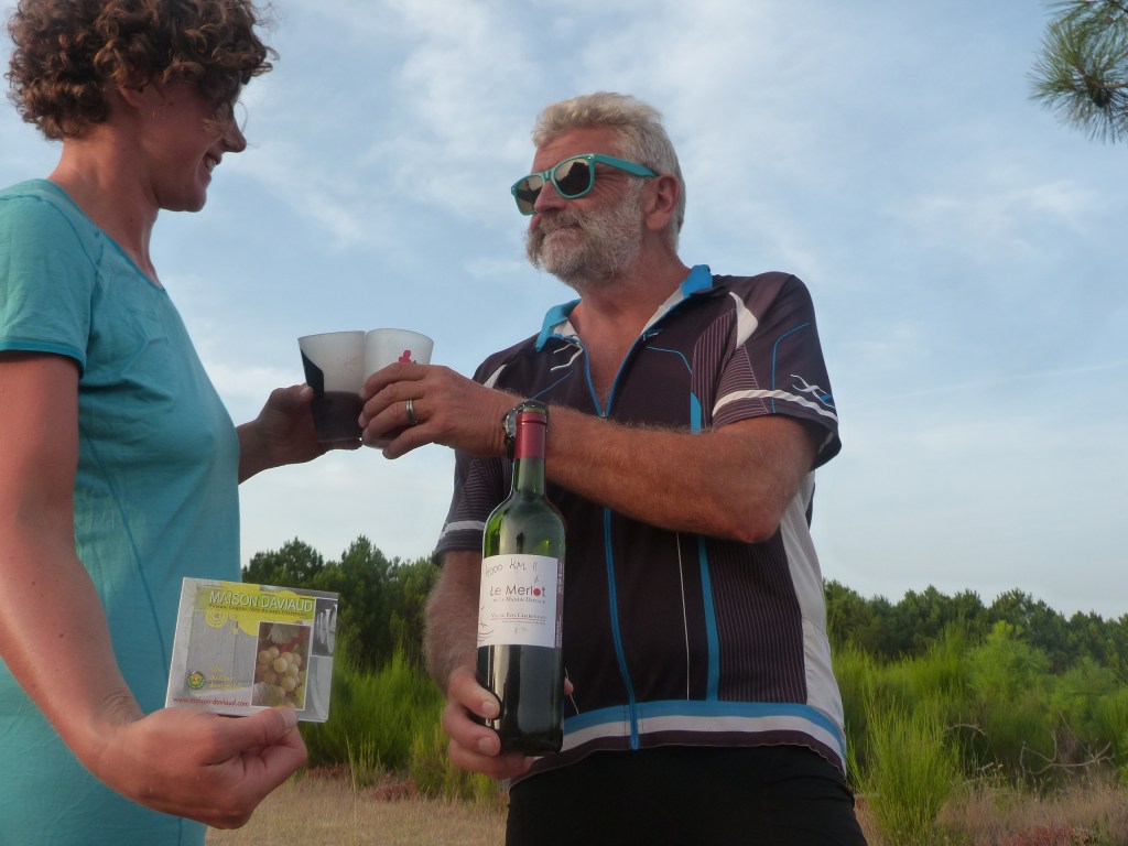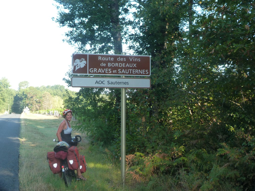 Décidé à goûter un Sauterne, nous nous arrêtons chez un caviste qui s’avère être une caviste. Nous lui expliquons que nous voulons un bon sauterne en demi bouteille si c’est possible du fait que nous sommes à vélo. Et à notre grande surprise elle nous parle du sauterne avec passion et nous l’écoutons avec assiduité pour finir par nous dire:
