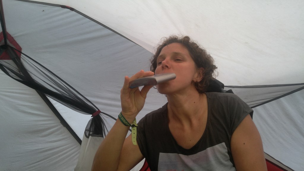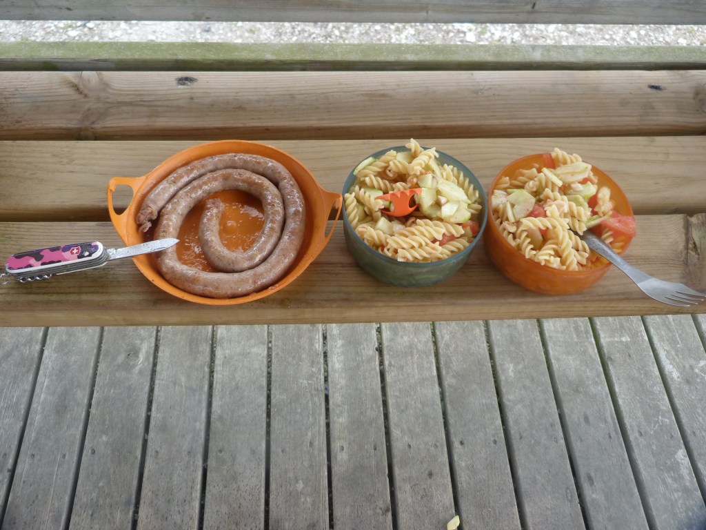 Il est temps de nous poser pour la nuit je ne sais si ce n’est la joie d’avoir un côte de Duras pour le repas du soir, mais je m’allonge un peu violemment sur mon matelas gonflable que j’avais posé directement sur la prairie, il ne résistera pas à des herbes sèches et dures. Pffft! l’air s’évade et c’est avec un air penaud qu’il va falloir que je dorme à même le sol. Heureusement, ma dulcinée me sauve avec du matériel de réparation spéciale pour les matelas!