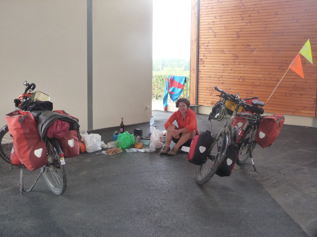 Une belle pluie orageuse nous bloquera sous la halle du marché récente et inoccupée ce jour, tout va bien il est midi, casse croûte, sieste et au moment de repartir le ciel est devenu plus clément.