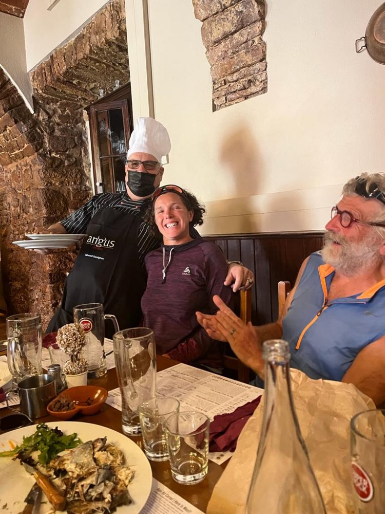Wim nous rejoint juste à temps pour aller au restaurant. Laetitia qui souhaite améliorer son portugais est chaque fois déçu , les serveurs parle très souvent la langue de Molière. A nouveau nous avons un serveur plein d’humour. Que nous sommes bien en ce Portugal, des paysages variés, un balisage dans l’ensemble très bien, de bon repas et des gens accueillant et plein d’humour. Mais que voulons nous de plus ?? Savoir apprécier ces instants vaut tout l’or du monde et bien plus encore, car ils apportent un bonheur de vivre, il donne un équilibre intérieur qui ne peut que favoriser une belle santé !