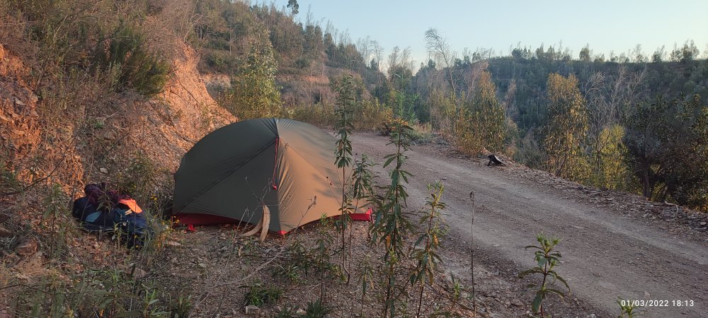 Le soleil décline doucement dans le ciel, nous trouvons un emplacement pour la tente en bord de piste