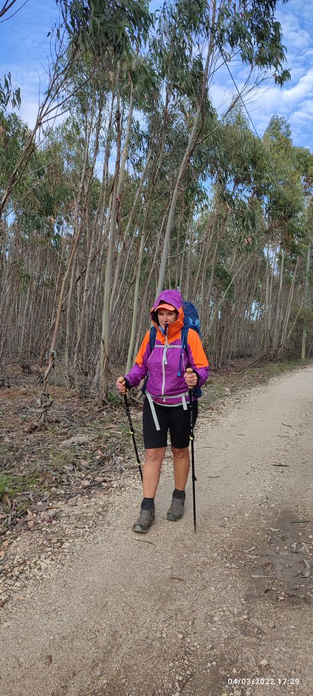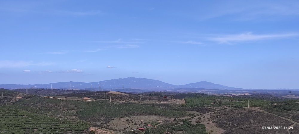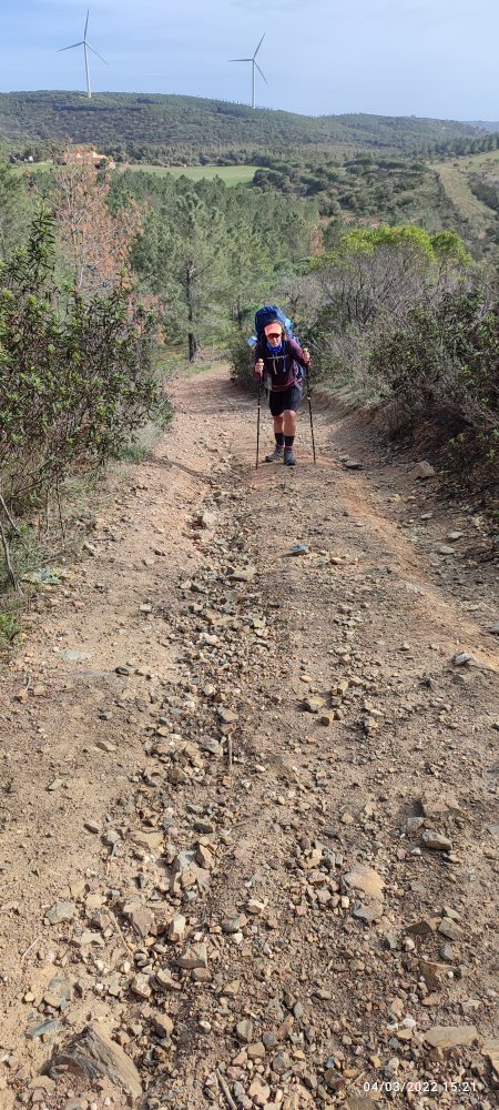 Nous traversons une belle forêt de pins qui nous mène au sommet d’une butte. De là nous avons une vue sur le sommet de Monchique au centre, le Mont Picota à droite, il y a quelques jours nous étions la haut ! En nous retournant à l’horizon nous apercevons l’océan. L’arrivée est proche !