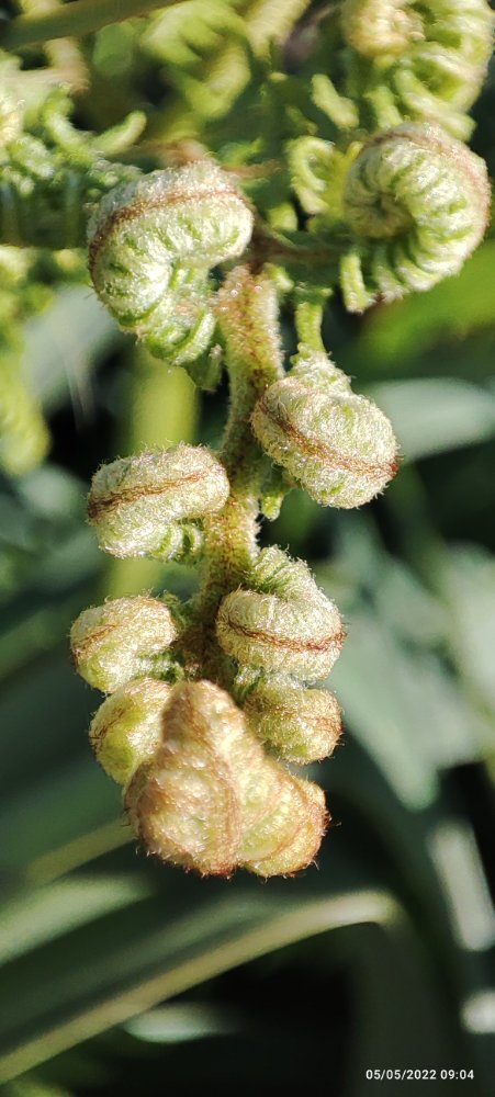 Puis une fougère dont les feuilles sont encore refermées sur elles ; seraient-ce des chenilles en mue? …