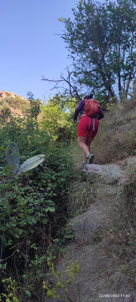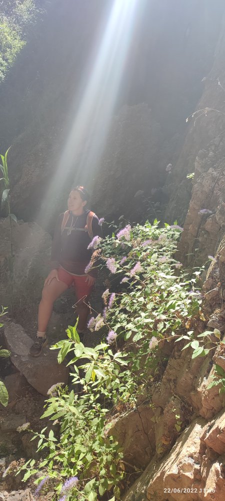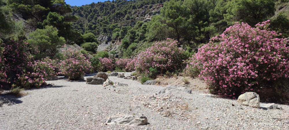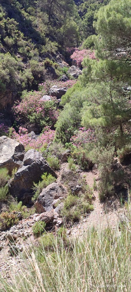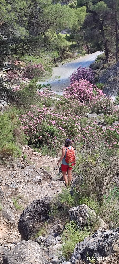 Puis nous empruntons un sentier qui sillonne au milieu d’une forêt de pins et nous fait perdre rapidement de l’altitude pour rejoindre un rio qui est à sec et dont le lie est envahi de laurier.